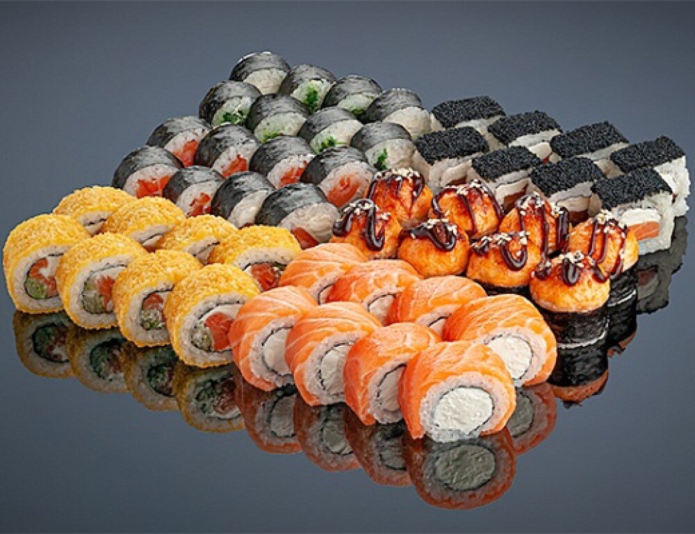 Филадельфия, Маки с лососем, Маки с огурцом ,темпура Филадельфия, Запечённый угорь, Калифорния найт.
