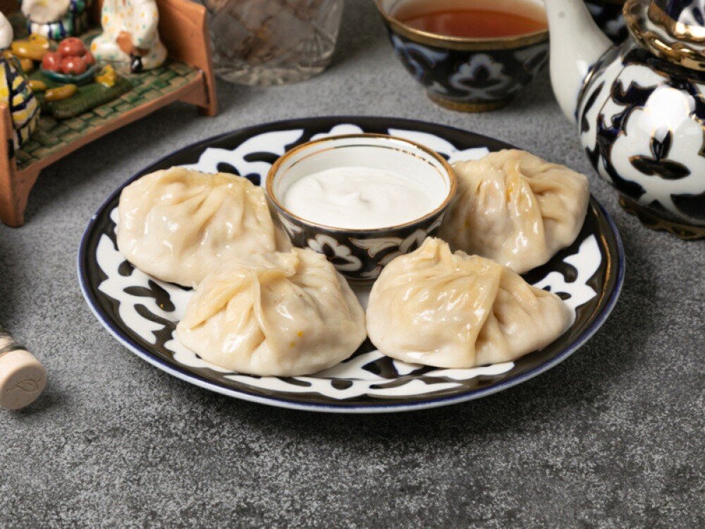 Традиционные узбекские манты, приготовленные на пару, с начинкой из рубленной говядины, лука и специй. Подаются со сметаной (5 шт)