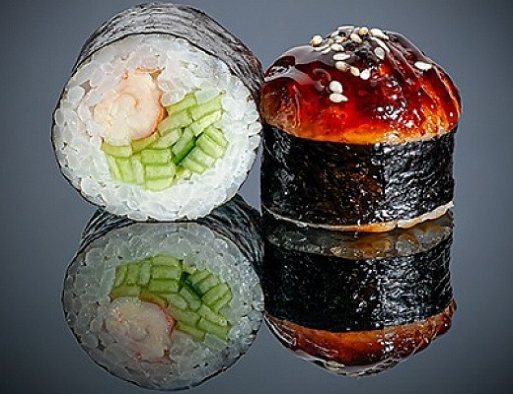 Нори, огурчик, тигровая креветка, спайси соус, соус унаги, кунжут.