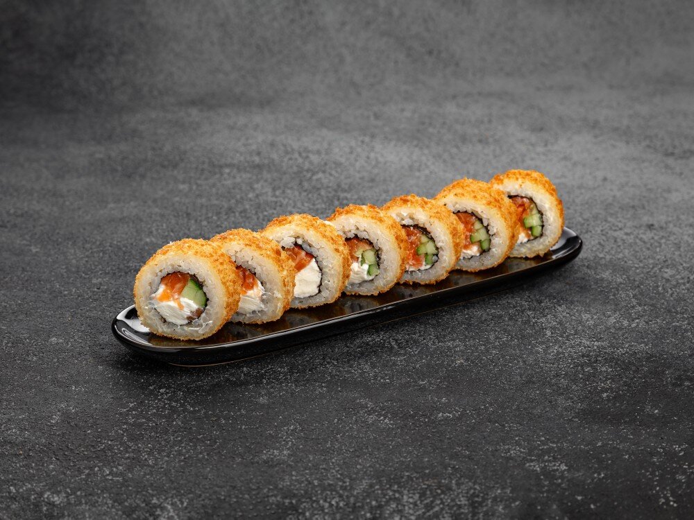 Хрустящая корочка темпуры обрамляет нежную начинку из сахалинского лосося, сливочного сыра и свежего огурца. Внутри ролла — гармоничное сочетание вкусов, которое оставляет приятное впечатление