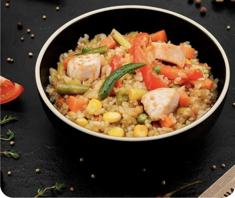 Рис,куриная грудка, перец болгарский,цукини,морковь, лук зелёный, фасоль стручковая,эдомаме, соус терияки,кунжут