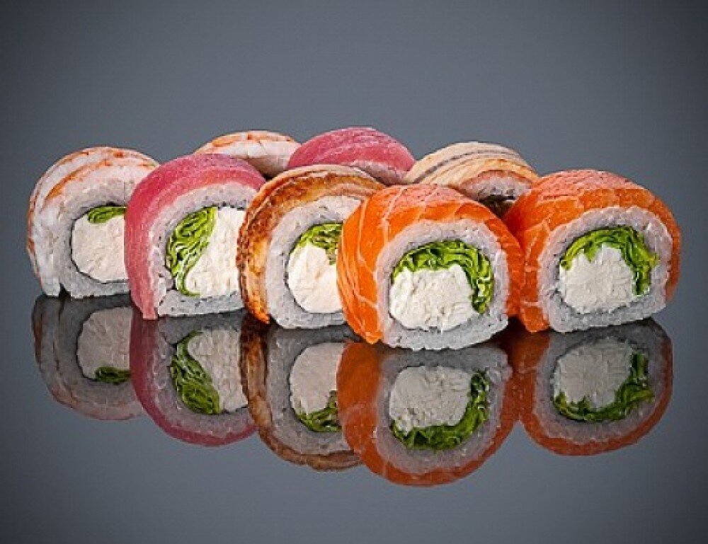 Лист салата, тунец, креветка, угорь(допускается попадание мелких костей), лосось, творожный сыр Cremette Professional.